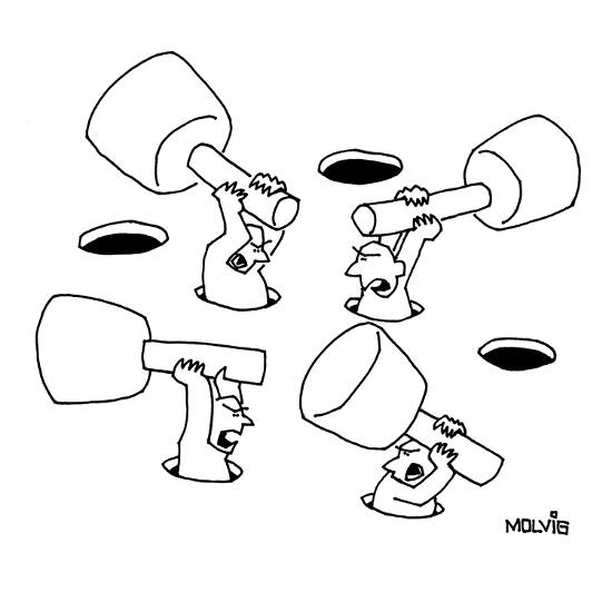 Guys With Mallets Coming Out Of Whack A Mole Holes Trying To Hit Each Othe New Yorker Cartoon Premium Giclee Print By Ariel Molvig Art Com